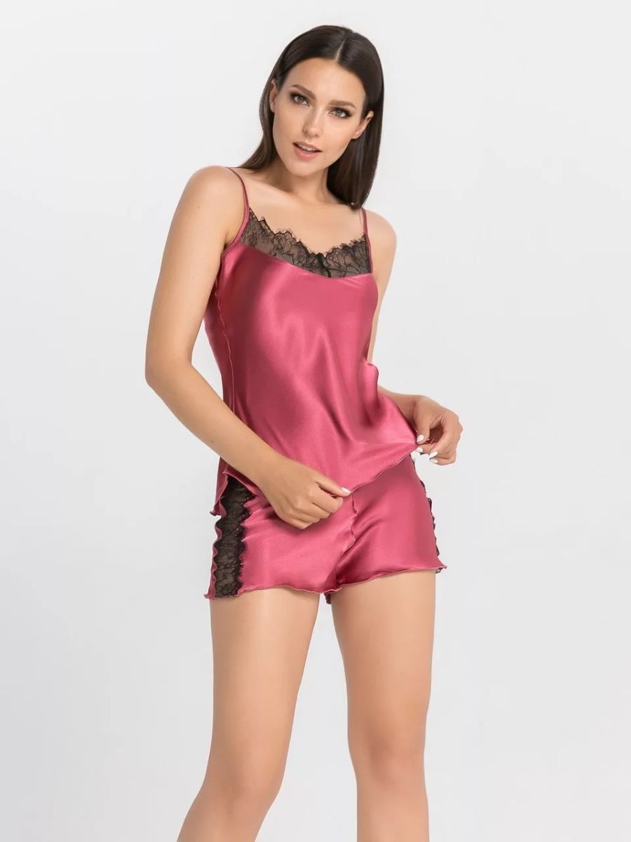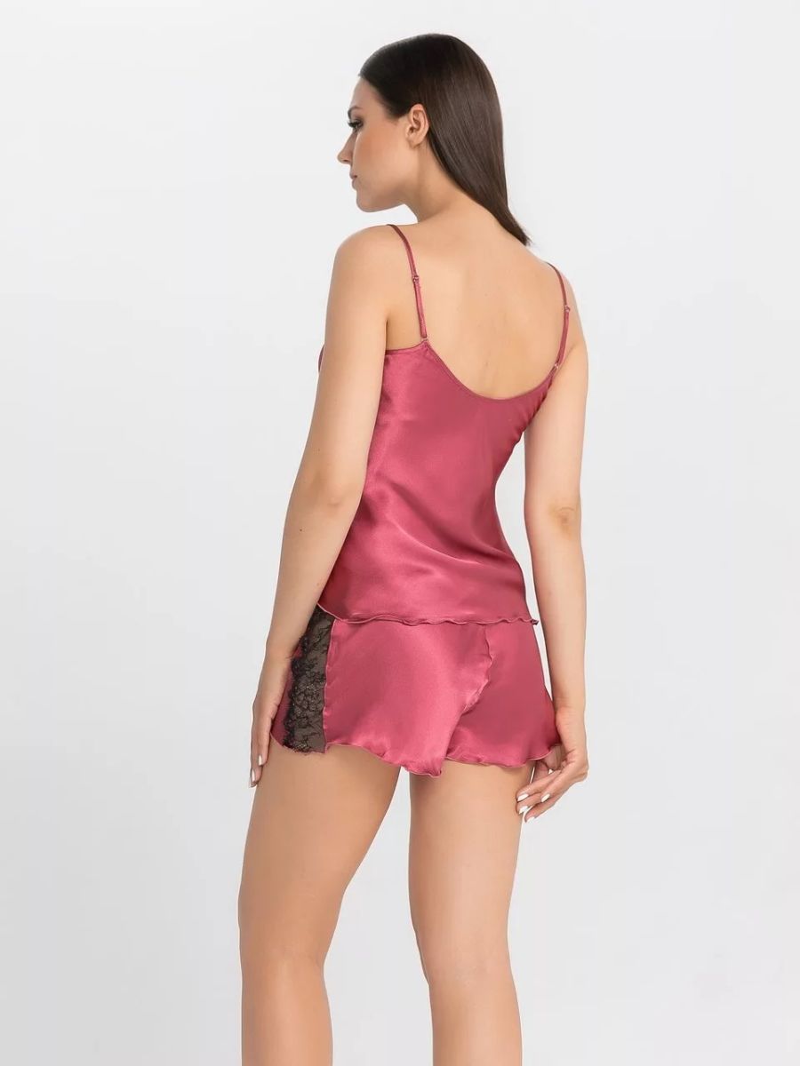 Комплект: топ и шорты из искусственного шелка, узкие бретели. Декорирована кружевом по линии выреза. В комплекте: топ, шорты.