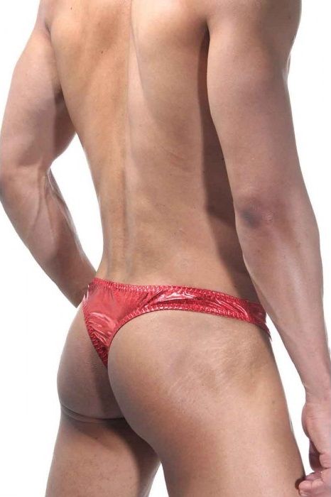 Тонги с низкой посадкой, у которых в шахматном порядке скомбинированы два цвета гладкой и блестящей ткани, красного и золотого цветов. Сзади трусы однотонного красного цвета.