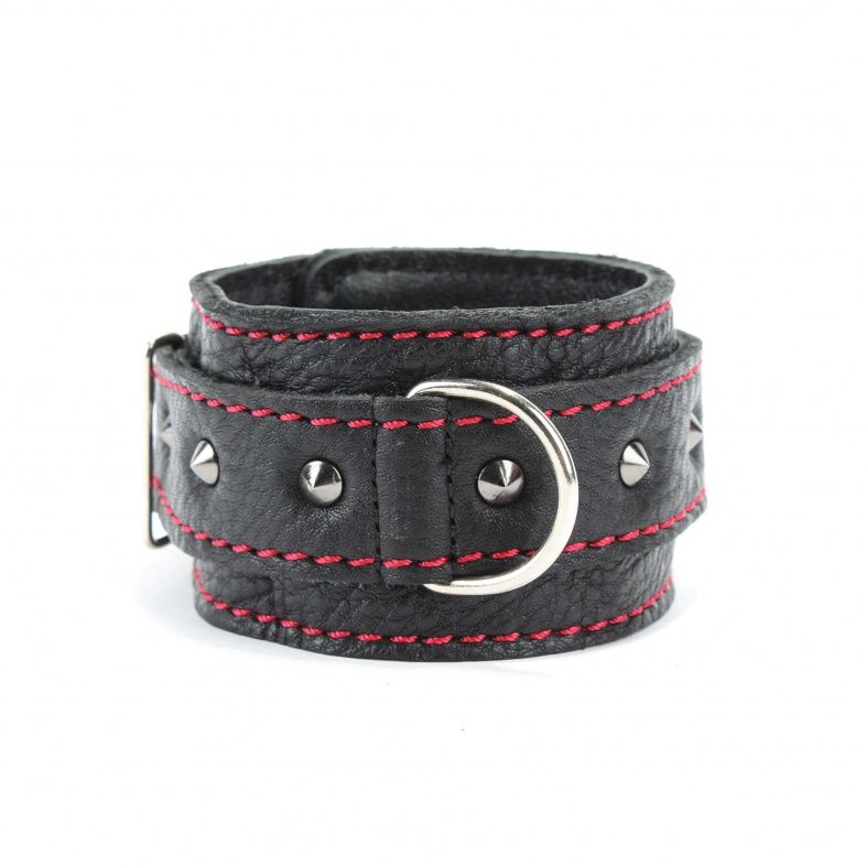 Оживить эротические игры Вам помогут поножи. Этот интимный аксессуар пользуется успехом. Выполненные в черном цвете с красной строчкой и украшены шипами. Модный интимный аксессуар не сдавливает и не нарушает кровообращение, так как изготовлен из мягкой кожи. Чтобы любимая никуда не убежала, поножи соединены короткой перемычкой. Длина перемычки - 6 см. Ширина оков - 5,3 см.