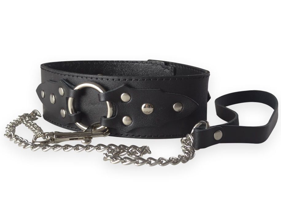 Чёрный ошейник из толстой натуральной кожи имеет внутреннюю подкладку из тонкой кожи. Так как ошейник достаточно широкий, хорошо просматривается текстура натуральной кожи, в виде мелкой паутинки. Декоративным элементом данного аксессуара, является металлическое кольцо, удерживаемое двумя кожаными узорчатыми накладка, оно также используется для присоединения поводка-цепочки к ошейнику. Размер изделия регулируется металлической пряжкой. Ширина - 5 см. Длина поводка - 40 см.